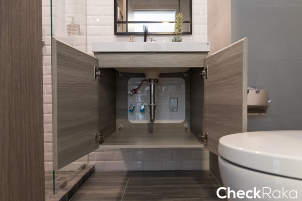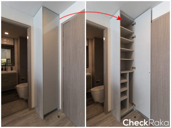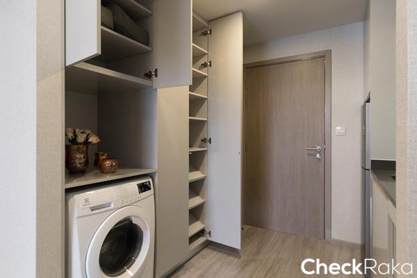 พื้นที่ด้านล่างสามารถวางอุปกรณ์ทำความสะอาดได้อีก ติดตั้งท่อน้ำดีน้ำทิ้ง และก๊อกน้ำไว้ให้สำหรับซักล้างที่ระเบียง