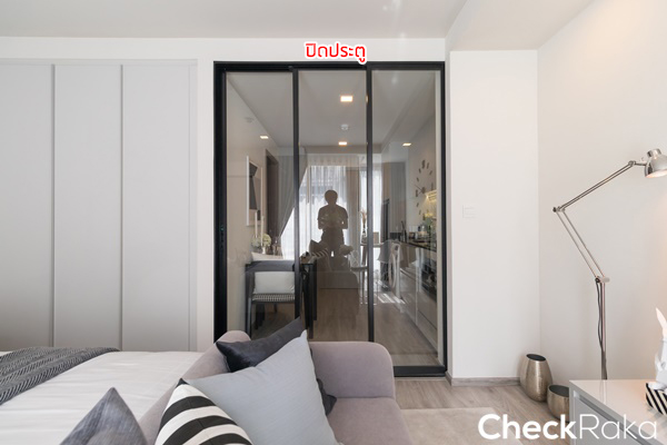 ระหว่างห้องครัวกับห้องนอนกั้นแบ่งเป็นสัดส่วนด้วยประตูกระจกบานเลื่อน 3 ตอนสีเขียวตัดแสง เปิดจากซ้ายไปขวา