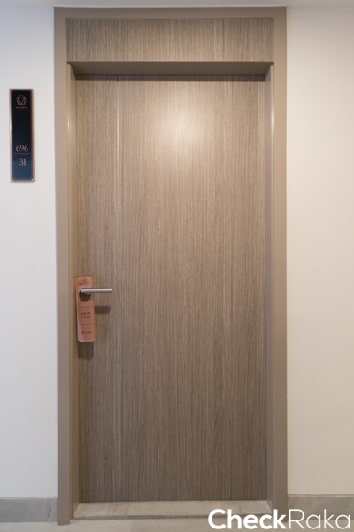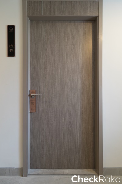 ประตูห้องนอนแบบบานทึบกั้นมิดชิดเป็นสัดส่วนชัดเจนกว่าห้องที่แล้ว มือจับก้านโยกพร้อมตัวล็อค