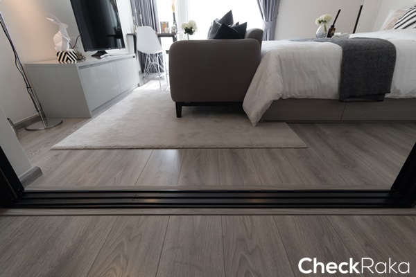 พื้นห้องนอนและโซนนั่งเล่นปูด้วยลามิเนตสีเดียวกับพื้นห้องครัว