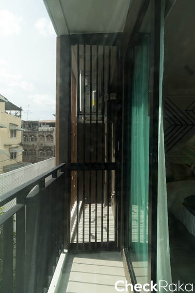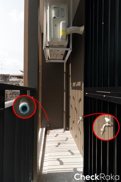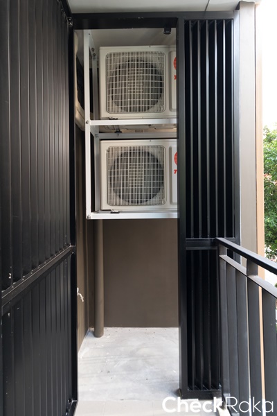 คอมเพรสเซอร์แอร์อยู่ด้านข้างของระเบียง เป่าลมร้อนออกด้านนอกอาคาร มีประตูเป็นระแนงบังสายตาไว้