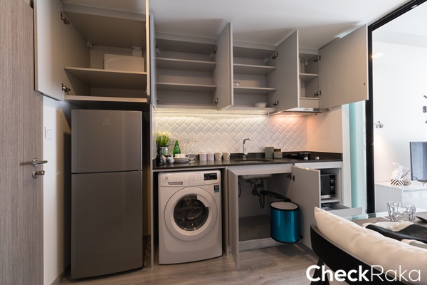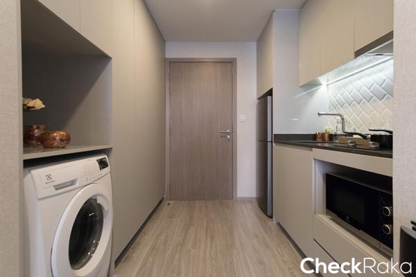 วางเครื่องซักผ้าใต้เคาน์เตอร์ครัว ช่องวางไมโครเวฟก็อยู่ด้านล่างเช่นกัน