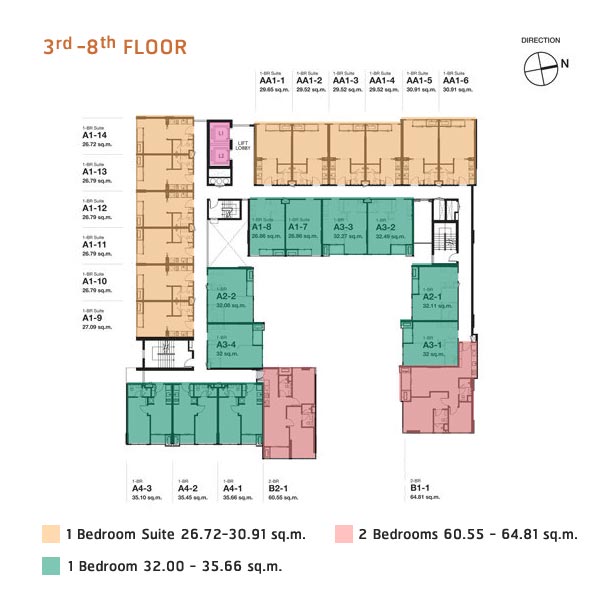 Floor Plan ชั้น 3-8 : จะคล้ายกันค่ะ คือจะมีห้องพักอาศัยจำนวน 25 ยูนิต/ชั้น