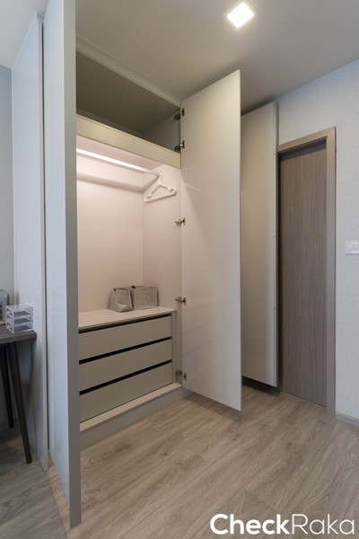 ตู้เสื้อผ้า Built-in เรียบเนียนกับผนัง ความสูงจากพื้นจรดฝ้าช่วยลดปัญหาเรื่องของฝุ่นบนหลังตู้