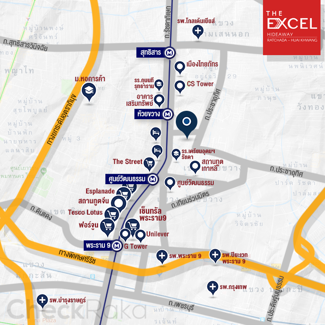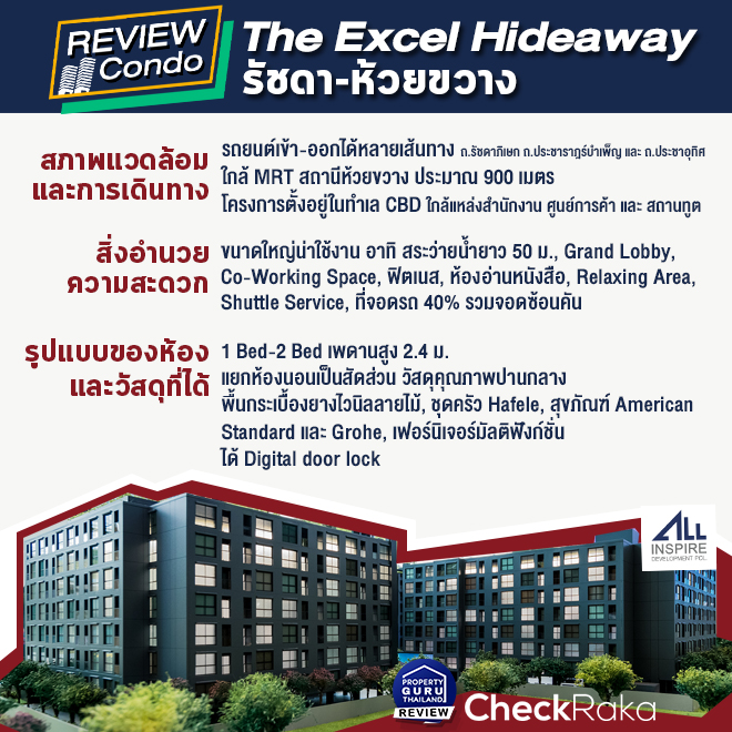 ดิ เอ็กเซล ไฮด์อะเวย์ รัชดา-ห้วยขวาง (The Excel Hideaway Ratchada-Huai Khwang) ใกล้รถไฟฟ้า MRT สถานีห้วยขวาง 900 เมตร จัดเต็มสิ่งอำนวยความสะดวก พร้อมสระว่ายน้ำความยาว 50 เมตร คอนโดแต่งครบ เฟอร์นิเจอร์แบบ Fully furnished จะน่าสนใจแค่ไหนตามไปชมกันค่ะ