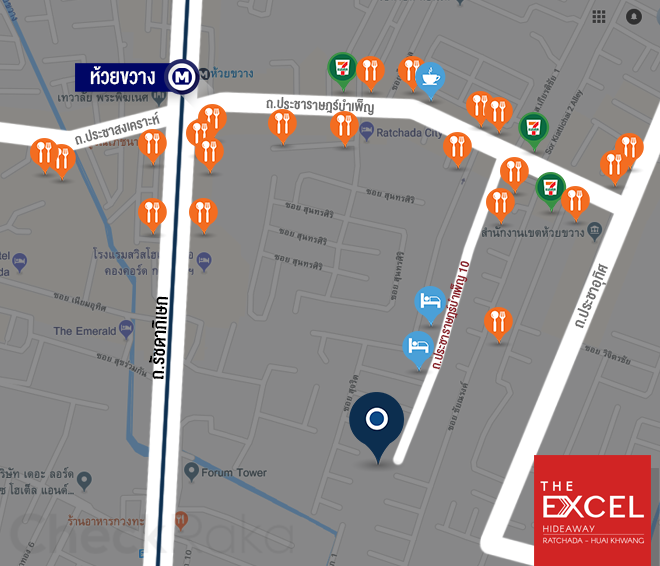 โครงการ ดิ เอ็กเซล ไฮด์อะเวย์ รัชดา-ห้วยขวาง (The Excel Hideaway Ratchada-Huai Khwang) ตั้งอยู่ในซอยประชาราษฎร์บำเพ็ญ 10 ข้อดีของการอยู่ในซอยคือให้ความเป็นส่วนตัวสูง ในซอยประชาราษฎร์บำเพ็ญนี้ ต้นซอยอยู่ที่ "แยกห้วยขวาง" ทอดยาวไปจนถึง "แยกประชาราษฎร์บำเพ็ญ" ที่ไปตัดกับถนนประชาอุทิศ ซึ่งถนนเส้นนี้สามารถเชื่อมต่อกับถนนสุทธิสารฯและถนนรามคำแหงได้ด้วย ความน่าสนใจอยู่ที่ซอยประชาราษฎร์บำเพ็ญถูกเรียกอีกอย่างว่า "เยาวราช 2" เพราะบรรยากาศในซอยเต็มไปด้วยอาคารพาณิชย์ ขายสินค้าหลายอย่างเกี่ยวกับชาวจีน ทั้งของกิน ของใช้ เครื่องสำอาง ที่ฮิตสุดเห็นจะเป็นหมอนยางพารา แน่นอนว่าชาวจีนเข้ามาค้าขายในย่านนี้เยอะมาก รวมถึงมาเที่ยวและพักในย่านห้วยขวางเยอะมากเช่นกัน จึงทำให้ความต้องการโรงแรม ที่พัก รวมถึงคอนโด ในซอยนี้คึกคักเป็นพิเศษ นอกจากนี้อาหารการกินก็กระจายอยู่ในซอยหลากหลายมากทีเดียว จะเป็นยังไงไปดูกันเลย