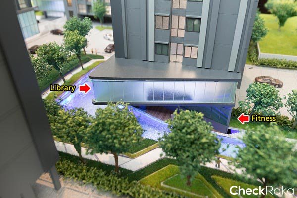 โมเดลจำลองสระว่ายน้ำที่ทอดยาวจากอาคาร C ถึงอาคาร B