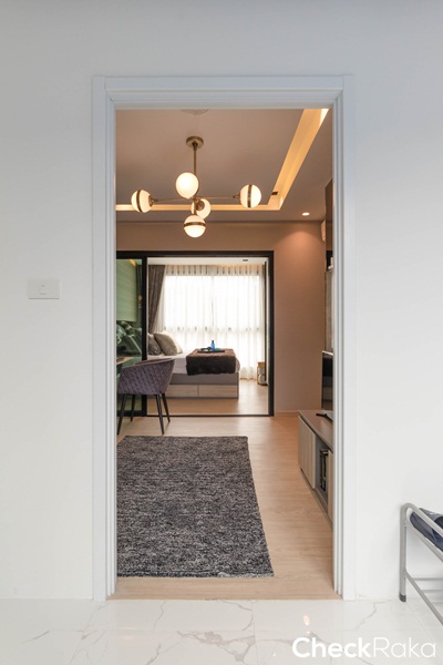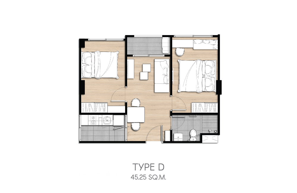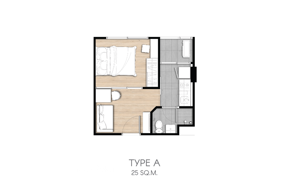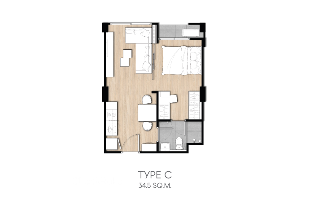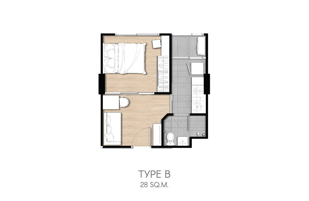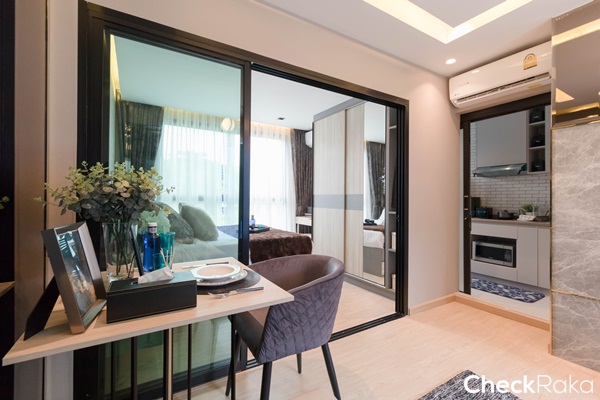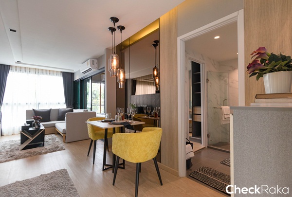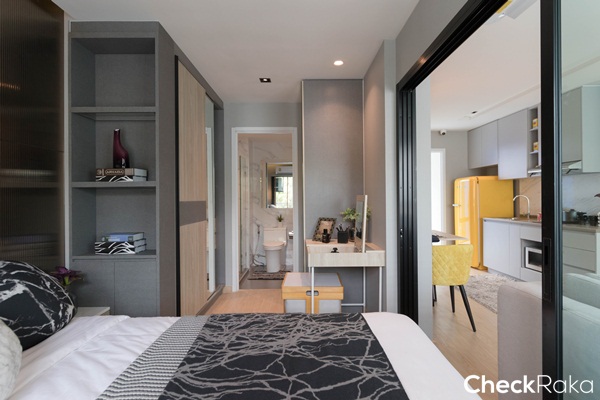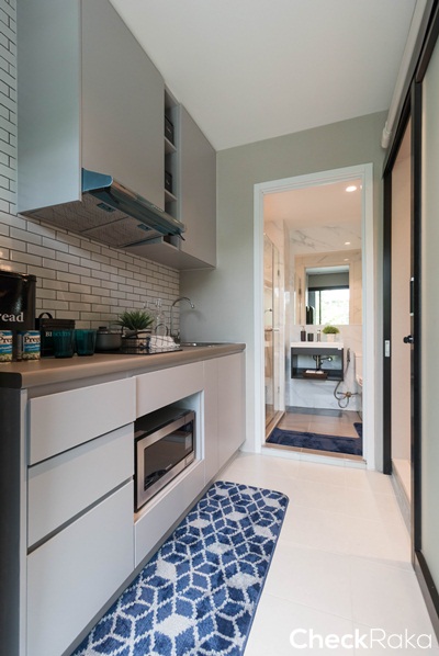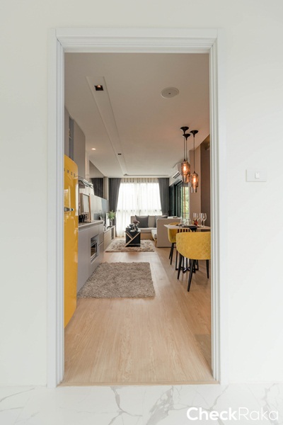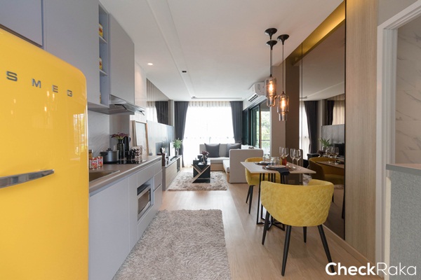 ห้อง Type นี้ได้จัดพื้นที่ครัวไว้ด้านหน้าเชื่อมต่อกับห้องนั่งเล่น ส่วนฝั่งขวาของห้องจะเป็นห้องนอนและห้องน้ำ