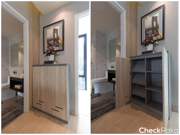 เข้ามาทางขวาเป็นตู้เก็บรองเท้าเจาะช่องระบายอากาศไว้ที่หน้าบานช่วยลดปัญหากลิ่นไม่พึงประสงค์