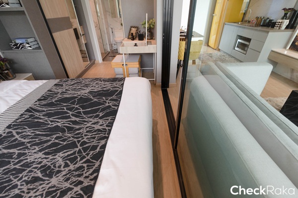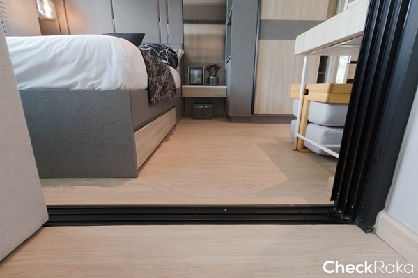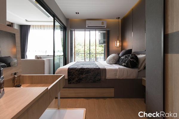 จากเตียงถึงประตูบานเลื่อนเหลือพื้นประมาณ 60 ซม. ทางโครงการ Built-in โต๊ะหัวเตียงมาให้ดูเป็นไอเดีย