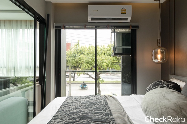 เตียงนอนวางชิดริมประตูที่จะออกไปยังพื้นที่ระเบียง