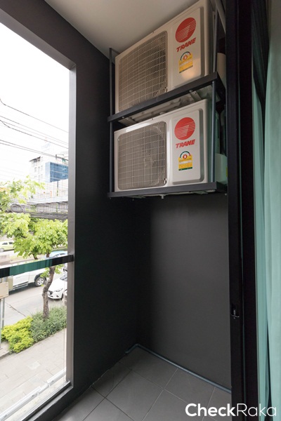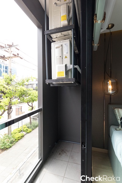 คอมเพรสเซอร์แอร์แขวนไว้ทางขวาเป่าลมร้อนเข้าระเบียง ควรติดกริลเพิ่มเพื่อเปลี่ยนทิศทางลมออกด้านนอกตัวอาคารแทน