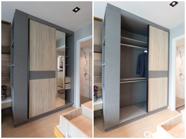 และตู้เสื้อผ้าบานเลื่อน Built-in สูงจรดฝ้า ฝั่งขวาสุดเป็นชั้นวางของแบบเปิดโล่ง