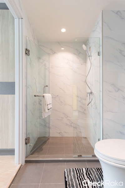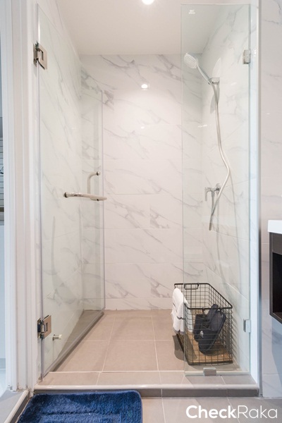 ได้ฉากกั้นอาบน้ำกระจกเทมเปอร์ พร้อมชุดฝักบัวทรงสี่เหลี่ยมของ Grohe เช่นกัน