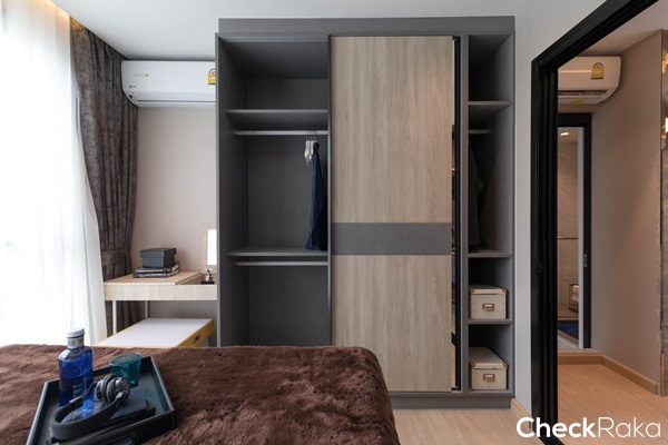 อีกฝั่งของห้องนอนเป็นโซนสำหรับแต่งตัวได้ตู้เสื้อผ้า, โต๊ะอเนกประสงค์ และเก้าอี้แบบมัลติฟังก์ชัน