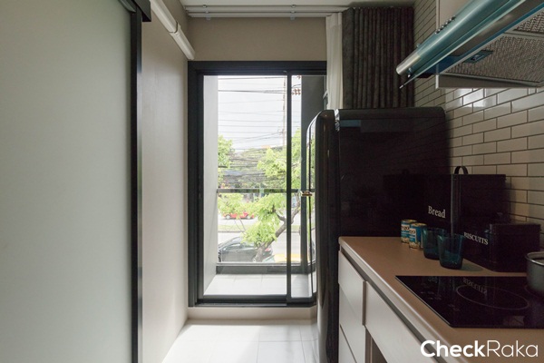 ทางซ้ายของเคาน์เตอร์ครัวเป็นที่วางตู้เย็น และถัดไปเป็นระเบียง