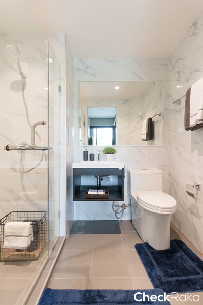 แบ่งการพื้นที่ใช้งานโซนแห้ง โซนเปียกมาให้เรียบร้อย ได้กระจกเงาบานใหญ่กรอบสีขาว