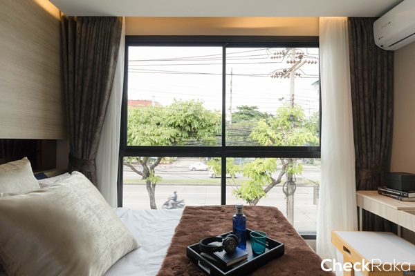 ในห้องนอนได้เตียงขนาด 5 ฟุต จัดวางเตียงนอนใกล้หน้าต่าง