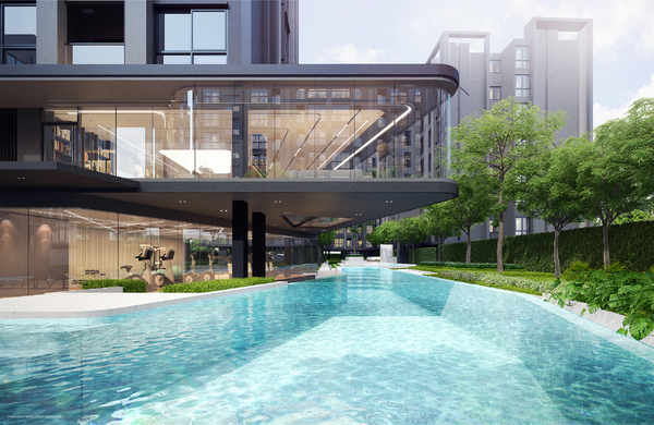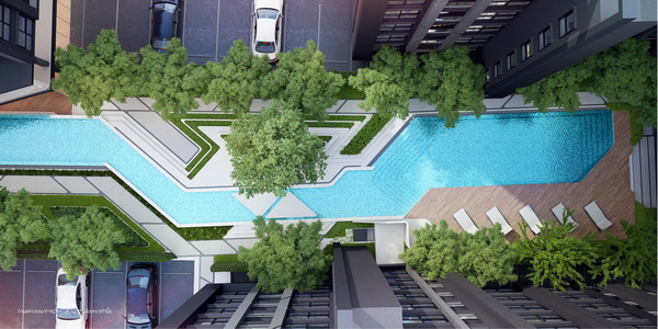 ลูกบ้านทั้ง 3 อาคารสามารถใช้ร่วมกันได้ ริมสระว่ายน้ำปลูกต้นไม้น้อยใหญ่เพื่อให้ร่มเงา