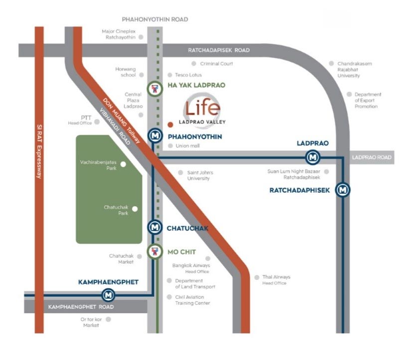 การเดินทางด้วยรถไฟฟ้า ก็เป็นอีกหนึ่งทางเลือกที่สะดวก โดยสถานีที่ใกล้ที่สุดที่เปิดให้บริการในปัจจุบันแล้วคือรถไฟฟ้า MRT สายสีน้ำเงิน สถานีพหลโยธิน ส่วนสถานีในอนาคตที่ใกล้ที่สุดคือสถานีห้าแยกลาดพร้าว เดี๋ยวตามเราไปเดินสำรวจเส้นทางกันค่ะ