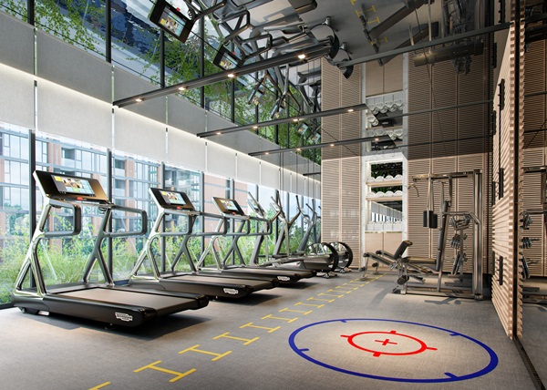 Facilities บนชั้น 2 ของอาคาร A Treehaus Lounge VR Simalator Fitness Room Functional Training Field ภาพจำลองบรรยากาศห้องฟิตเนส ห้องออกกำลังกายพร้อมเครื่องออกกำลังกายประมาณ 8 เครื่อง ออกแบบให้เป็นกระจกรอบด้านรวมถึงบนฝ้าเพดานก็ยังคงตกแต่งด้วยกระจกเช่นกันทำให้ได้ความรู้สึกโปร่งและทำให้ห้องดูกว้างยิ่งขึ้น จัดพื้นที่บางส่วนเป็น Functional Training Field พื้นที่สำหรับเตรียมพร้อม Warm-up หรือ Cool-down ก่อนและหลังการออกกำลังกาย