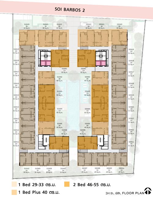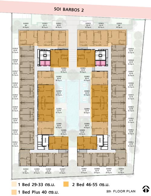 วิวสระว่ายน้ำด้านในทั้งหมดจะเป็นห้องใหญ่แบบ 1 ห้องนอน ขนาด 40 ตร.ม. และแบบ 2 ห้องนอน ขนาด 46 ตร.ม. และ 55 ตร.ม. วิวด้านนอกฝั่งทิศตะวันออก และทิศตะวันตก ก็จะเป็นแบบ 1 bedroom ขนาด 31 ตร.ม. ทั้งหมด ด้านหน้าโครงการฝั่งทิศเหนือ เป็นห้องแบบ 1 ห้องนอน ขนาดห้อง 40 ตร.ม. ด้านหลังฝั่งทิศใต้ เป็นห้องแบบ 1 ห้องนอน ขนาด 29 ตร.ม. และ 33 ตร.ม. Floor Plan ชั้น 3 - 7 : เป็นคล้ายกันคือเป็นห้องพักอาศัยทั้งหมด