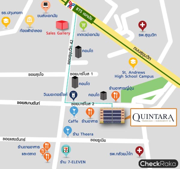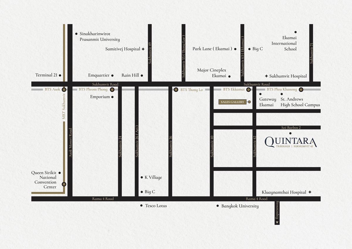 รูปแผนที่โครงการ ควินทารา ทรีเฮาส์ สุขุมวิท 42 (คลิกเพื่อดูภาพขนาดใหญ่) ในส่วนของการเดินทางด้วยรถยนต์ส่วนตัวสามารถเดินทางเข้า-ออกโครงการได้หลายเส้นทาง ทั้งถนนสุขุมวิท และจากทางถนนพระราม 4