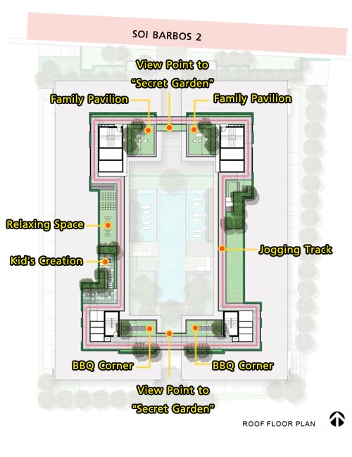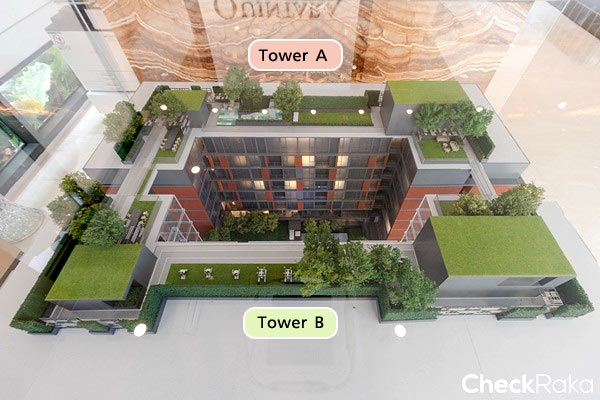 Facilities บนชั้น Rooftop ของทั้ง 2 อาคาร Ozone Space พื้นที่สีเขียวบนชั้นดาดฟ้า Passive Zone พื้นที่นั่งเล่น Family Pavilion พื้นที่สำหรับนั่งเล่น BBQ Corner ลูกบ้านสามารถขึ้นมาทำอาหารทานเล่น หรือจัดปาร์ตี้เล็กๆ บนนี้ได้ Kid's Creation สนามเด็กเล่น Relaxing Space พื้นที่สำหรับออกกำลังกายแบบมี movement ที่ไม่ต้องใช้อุปกรณ์ เช่น การ Jump หรือการ Squat เพื่อเสริมสร้างกล้ามเนื้อ Jogging Track สามารถวิ่งวนเป็นวงกลมได้ ความยาว 180 เมตร View Point to "Secret Garden" (สะพานกระจกเชื่อมระหว่างอาคาร A และอาคาร B) สามารถเทควิวสระว่ายน้ำ และพื้นที่สีเขียวด้านล่างได้ ภาพจำลองบรรยากาศสิ่งอำนวยความสะดวกบนชั้น Rooftop