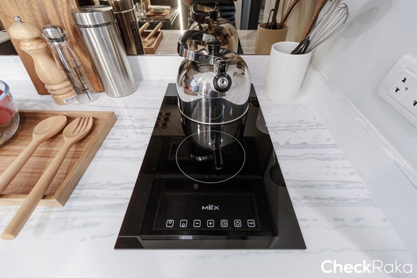 ห้องนี้ได้เตาไฟฟ้า 4 หัว ระยะทำครัวจากเคาน์เตอร์ครัวถึงผนังกว้างประมาณ 100 ซม.