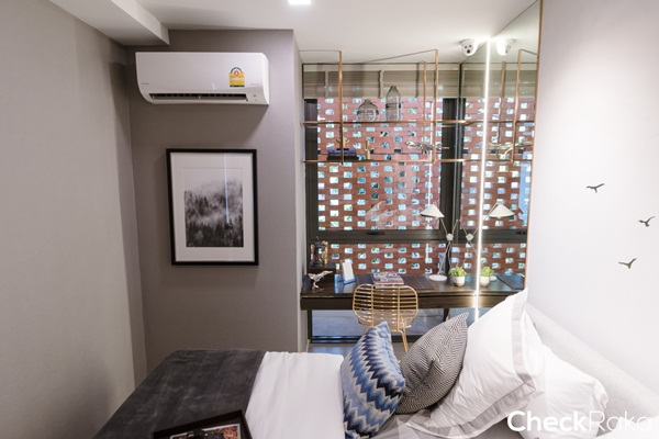 พื้นที่ริมหน้าต่างห้องนี้ทางโครงการวางโซฟาเบดมาให้ดูเป็นไอเดีย ถือเป็นการเพิ่มมุมพักผ่อนให้ให้กลับห้องนอนได้ดี