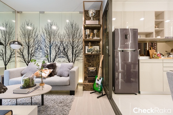 ระหว่างโซฟากับห้องครัวเหลือพื้นที่อีกนิดหน่อย สามารถ Built-in เป็นตู้โชว์ หรือเป็นตู้เก็บของได้