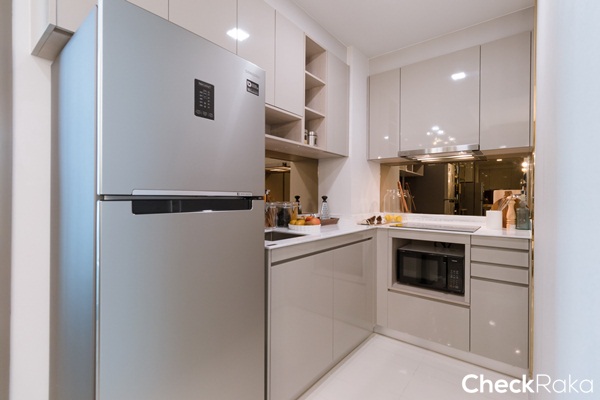 ยังคงได้เป็นครัวเปิด ได้เคาน์เตอร์ครัวรูปตัว L ได้พื้นที่เตรียมอาหาร และช่องสำหรับเก็บของเยอะขึ้นกว่าห้องที่แล้ว