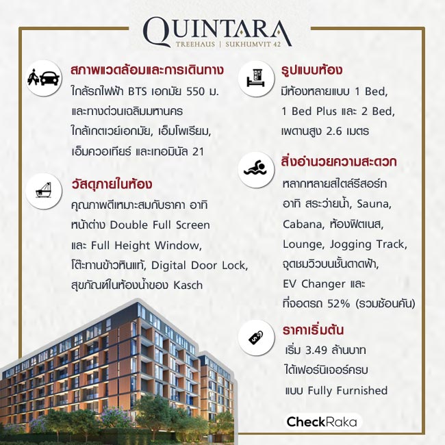 ควินทารา ทรีเฮาส์ สุขุมวิท 42 (Quintara Treehaus Sukhumvit 42) จากบริษัท อีสเทอร์น สตาร์ เรียล เอสเตท ที่ส่วนใหญ่จะทำโครงการระดับ Luxury หน่อย โดยโครงการนี้มาพร้อมคอนเซปต์ กับการใช้ชีวิต ใกล้ชิดธรรมชาติ ในความเป็นส่วนตัวใจกลางเมือง บนทำเลใกล้รถไฟฟ้า BTS สถานีเอกมัย เพียง 550 เมตร เท่านั้น พร้อมสิ่งอำนวยความสะดวกดีไซน์เหนือระดับคุณภาพเทียบเท่าโครงการ High-rise จะสวยแปลกตาและมีความน่าสนใจขนาดไปตามไปชมกันเลยค่ะ