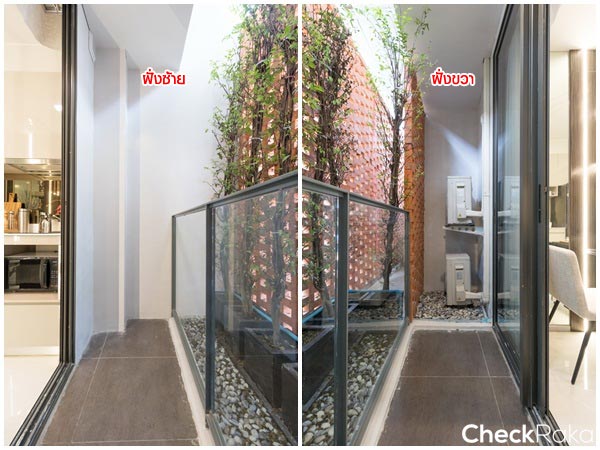 คอมเพรสเซอร์แอร์อยู่ทางขวาของระเบียง ติดตั้งที่บังสายตาไว้ให้เช่นเคย