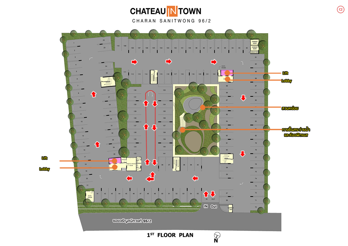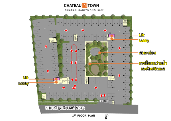 ส่วนการเดินรถภายในโครงการจะเป็นแบบเดินรถทางเดียว (one - way) โดยจากประตูทางเข้าโครงการ ขับผ่านไม้กั้นกระดก แบบ Easy Pass เหมือนทางด่วนเข้ามาแล้วจะให้เลี้ยวทางซ้ายวิ่งลอดใต้อาคาร B วิ่งวนเป็นวงกลมแล้วกลับมาออกที่หน้าโครงการ