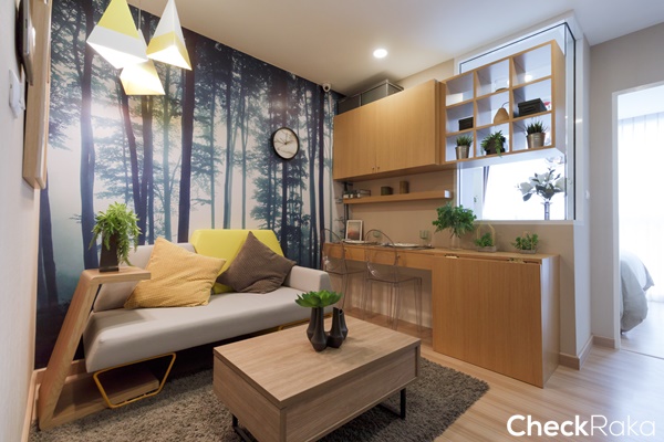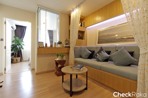 โซนแรกที่เจอะคือห้องนั่งเล่น ทางโครงการวางเป็นโซฟาขนาด 3 ที่นั่งยาวตลอดแนวผนัง ตกแต่งด้วยม่านดูน่ารักๆ