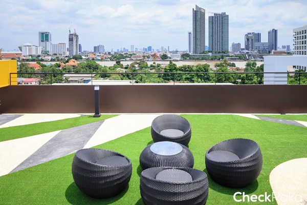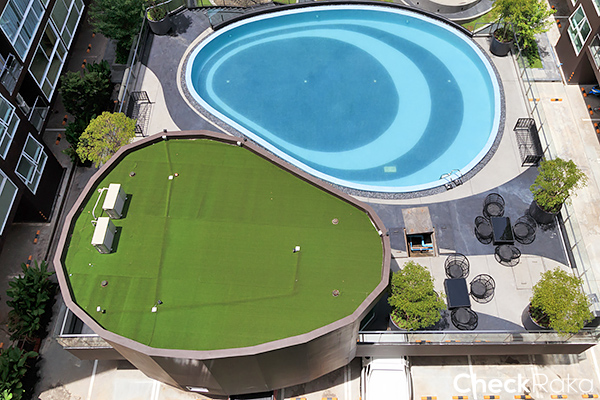 บนดาดฟ้าอาคารสระว่ายน้ำ ก็จัดเป็นส่วนหย่อมขนาดพื้นที่ประมาณ 291.10 ตร.ม. มาให้ด้วย