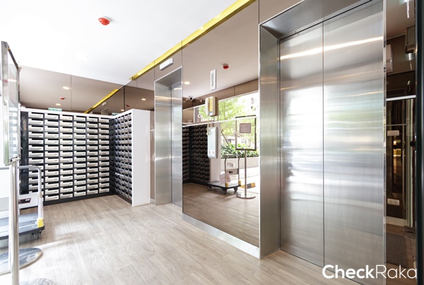 เดินเข้าประตูมาจะเจอกับโถงลิฟต์ ที่นี่มีลิฟต์โดยสารให้อาคารละ 2 ตัว