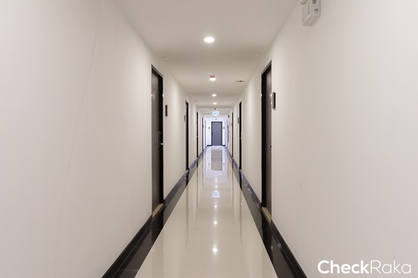 โถงทางเดินกว้าง 1.5 เมตร ติดตั้งไฟสำรองสำหรับกรณีเกิดเหตุฉุกเฉิน หรือไฟดับไว้ให้