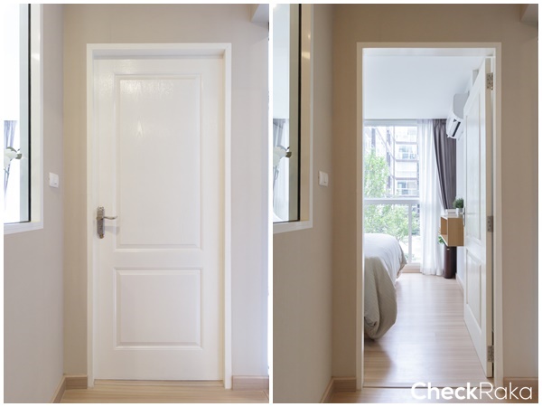 ประตูห้องเป็นวัสดุ HDF พร้อมช่องตาแมว และมือจับประตูก้านโยก
