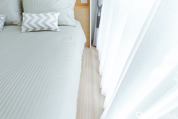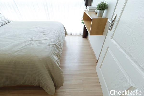 ความสูงจากพื้นถึงฝ้า 2.5 เมตร ผนังห้องเป็นสีขาวฉาบเรียบ พื้นเป็นลามิเนตความหนา 8 มม.