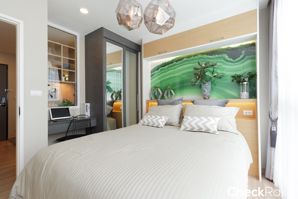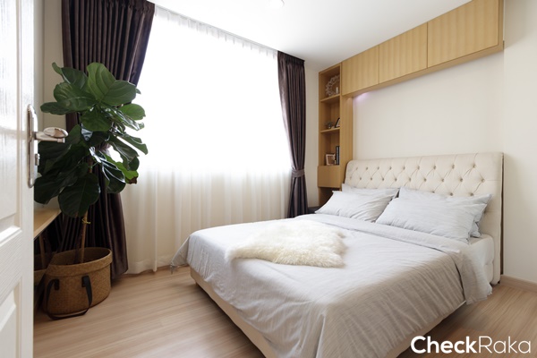 ผนังปลายเตียงสามารถ Built - in เป็นชั้นวางของ หรือชั้นวางทีวีได้