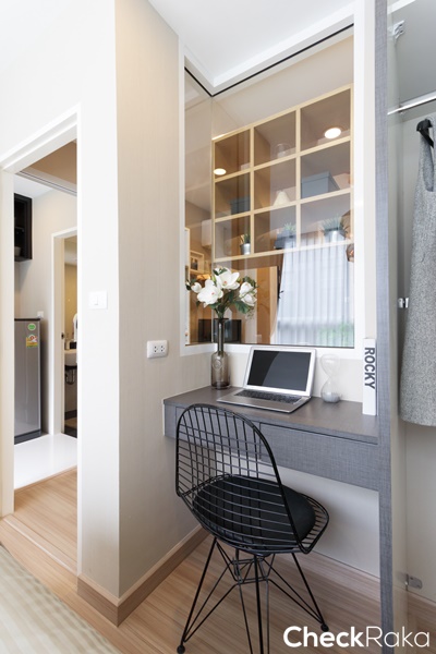 โต๊ะเครื่องแป้ง ทางโครงการไม่ได้ติดกระจกเงามาให้ ผนังตรงจุดนี้ออกแบบเป็นกระจกเงาแบบเข้ามุมมาให้ ทำให้ห้องดูโปร่งมากยิ่งขึ้น