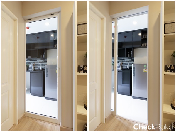 ห้องครัวกั้นเป็นสัดส่วนด้วยประตูกระจกบานเลื่อนกรอบอะลูมิเนียมสีขาว
