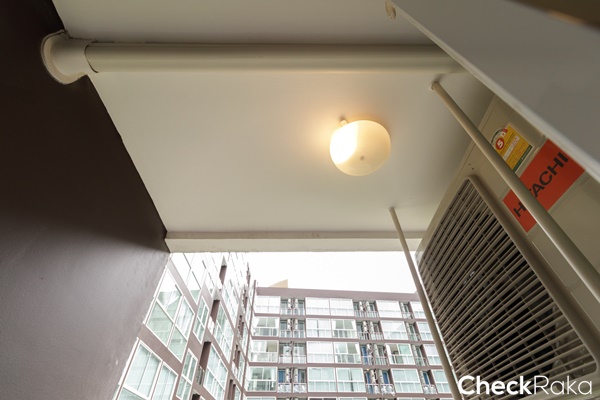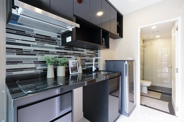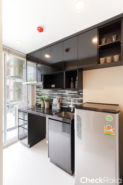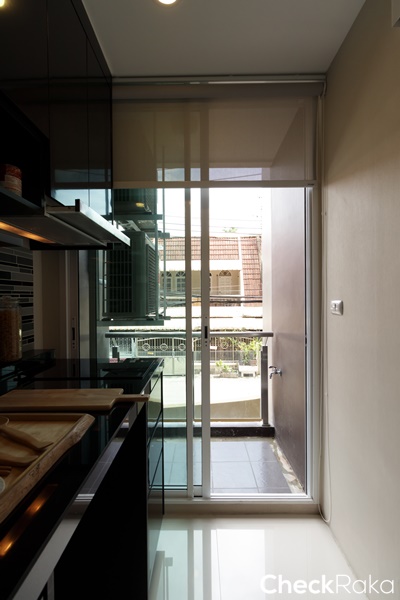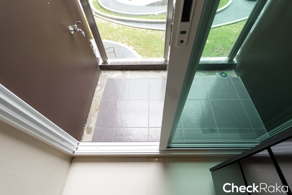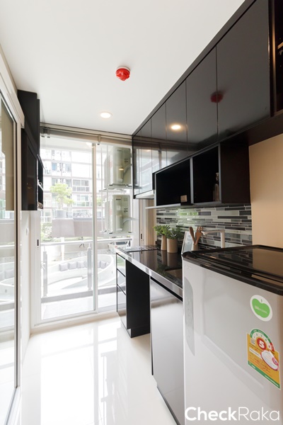 ห้องครัวติดกับพื้นที่ระเบียง ยกธรณีสูงประมาณ 10 ซม. ป้องกันน้ำฝน และน้ำด้านนอกระเบียงได้ดี