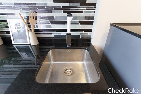 ผนังบริเวณเคาน์เตอร์ครัวติดกระเบื้องโมเสคสำหรับกันเปื้อนมาให้โทนสีขาวเทาดำ