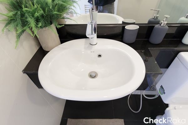 เคาน์เตอร์อ่างล้างหน้าเป็นหินแกรนิตสีดำ มีพื้นที่สำหรับวางของใช้ได้พอสมควร