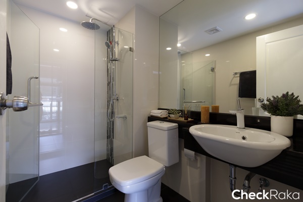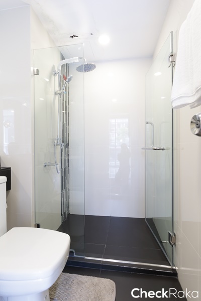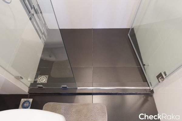 พื้นห้องน้ำลดระดับลงประมาณ 3 ซม. ปูด้วยกระเบื้องแกรนิตโต้ ขนาด 60 x 60 ซม.