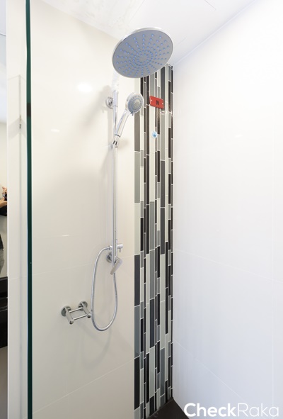 ผนังบริเวณ Shower กรุด้วยกระเบื้องแกรนิตโต้ ขนาด 60x60 ซม. บางส่วนตกแต่งด้วยกระเบื้องโมเสคโทนสีเทาดำ