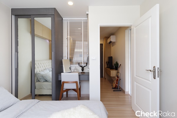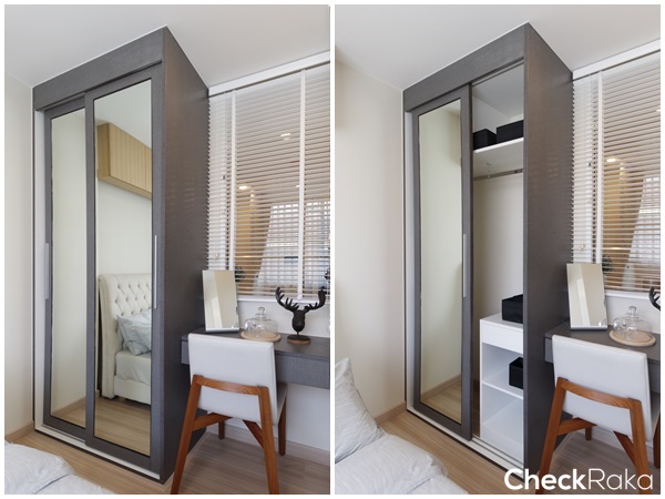 ในห้องนอนได้ตู้เสื้อผ้า และโต๊ะเครื่องแป้ง วัสดุมาตรฐานของโครงการ อยู่ทางซ้าย
